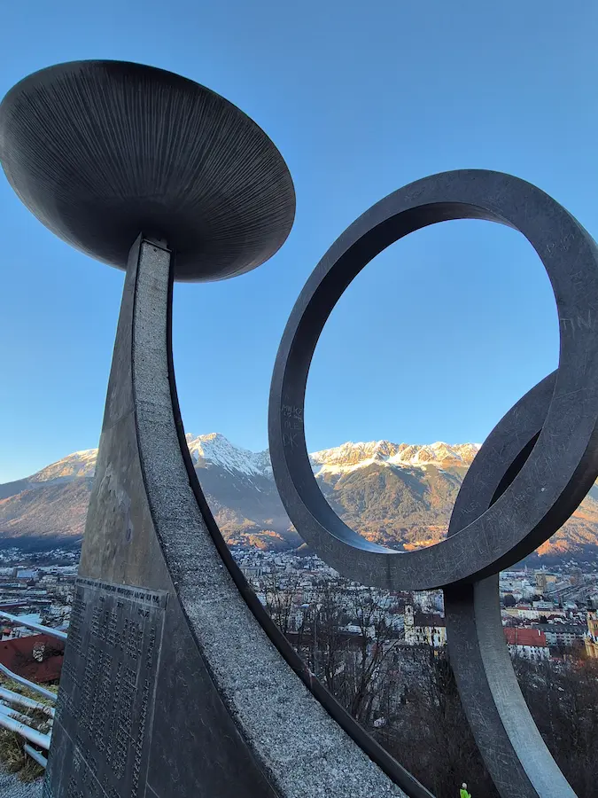 Hoewel de huidige schans die twee Olympiades niet heeft meegemaakt, is de Olympische geschiedenis hier op de Bergisel nog letterlijk tastbaar, en niet alleen in het kleine museum naast de tribune. Op een plateau aan de rand van de berg, net boven het hoogste punt van de 28.000 zitplaatsen tellende tribune, staan de Olympische ringen en de schalen waarin het Olympisch vuur werd ontstoken. Op een namenmonument staan alle winnaars van gouden, zilveren en bronzen medailles van de toenmalige Olympische disciplines. Dat waren er een stuk minder dan nu: van snowboarden en shorttracken had nog niemand gehoord.